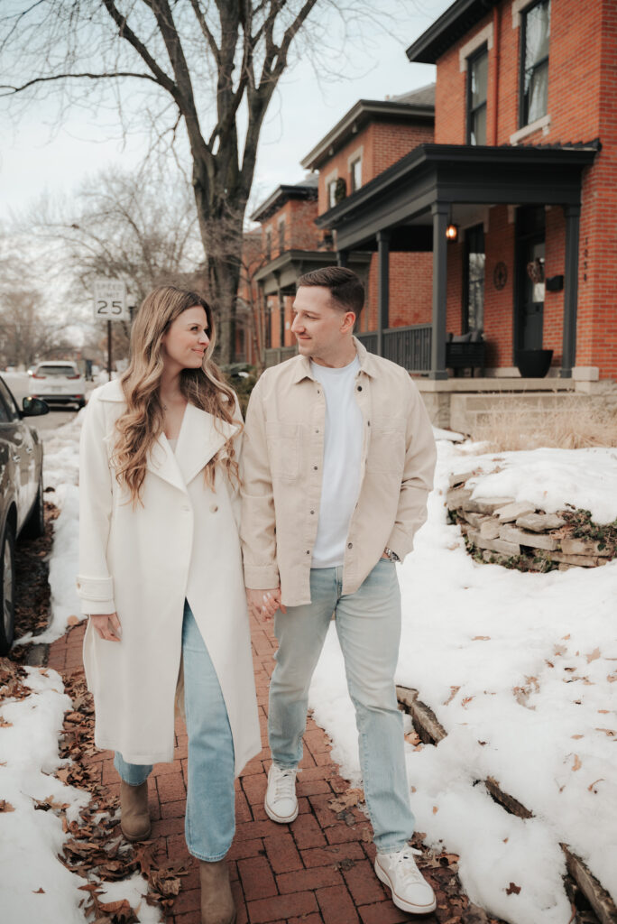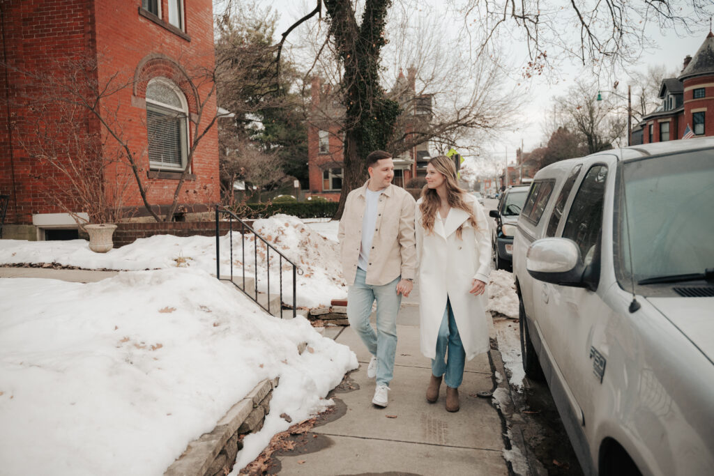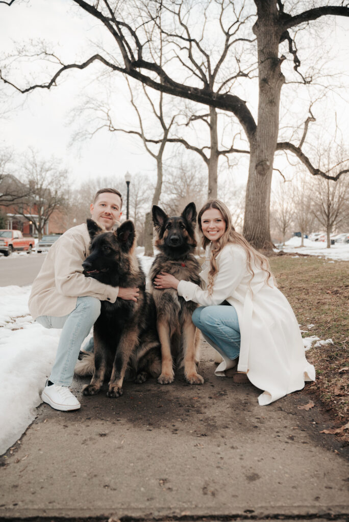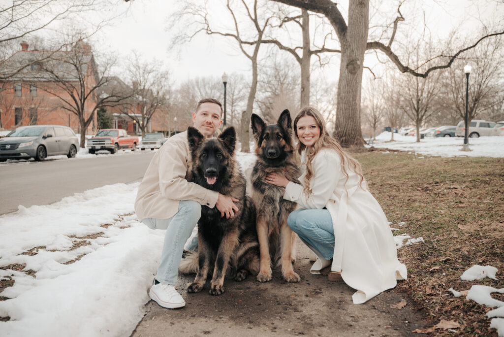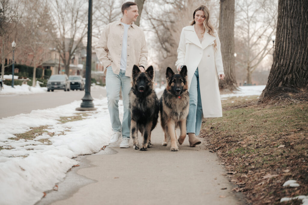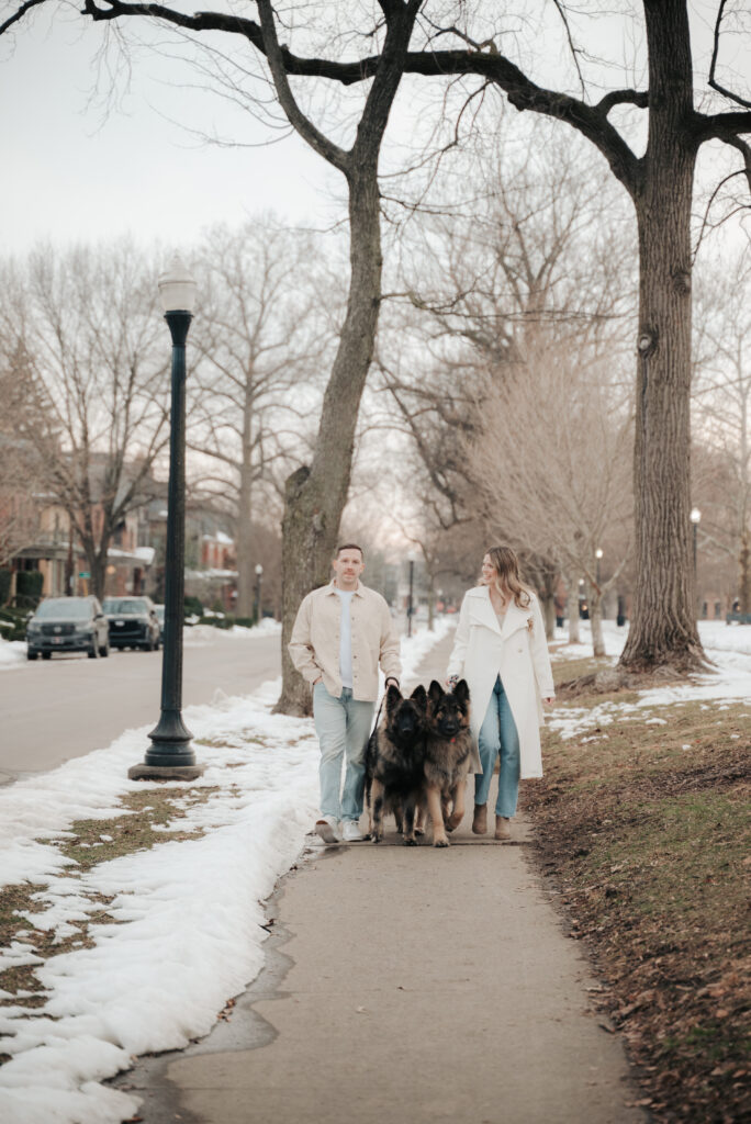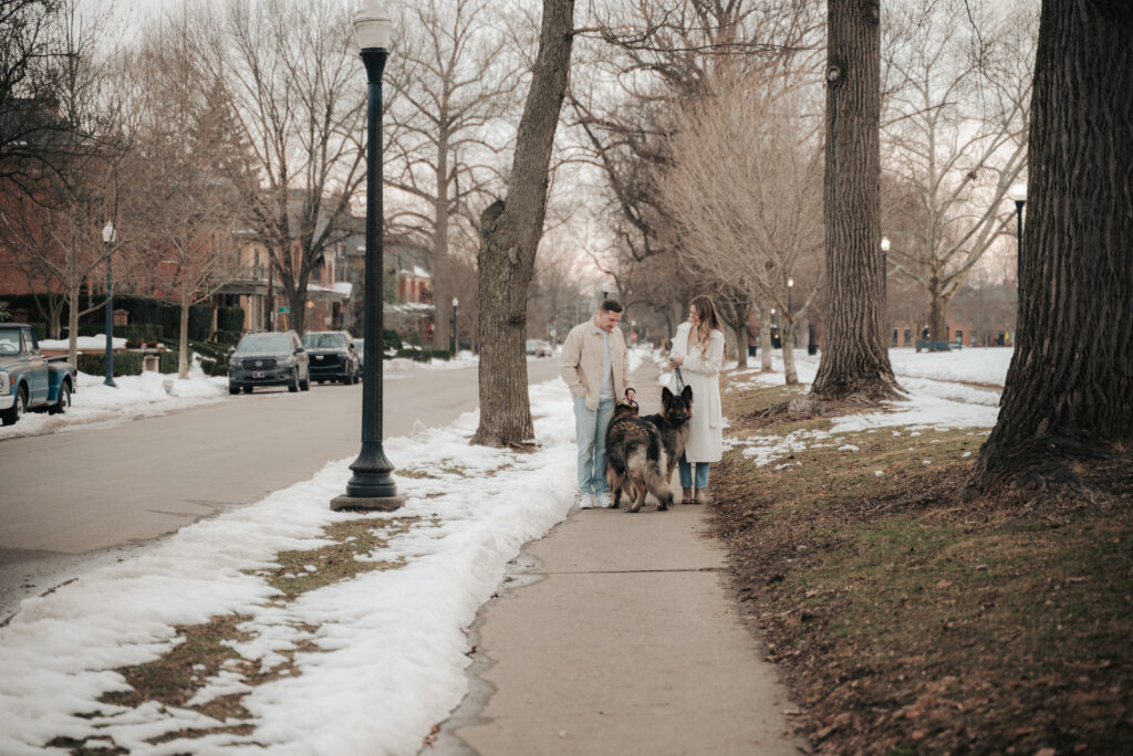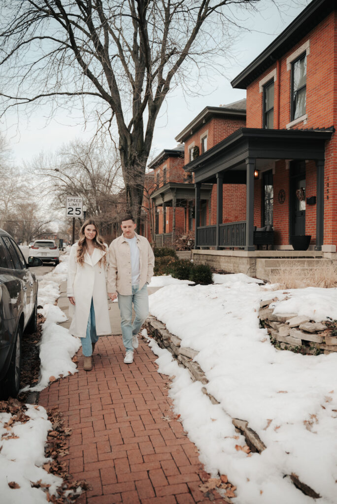 After the Statehouse, we ended the night in German Village with their dogs. This part felt especially sweet. Snow lined the sidewalks, the trees were bare, and the neighborhood was quiet in that peaceful winter way. Watching them walk side by side with their dogs felt like getting a glimpse into their everyday life together.