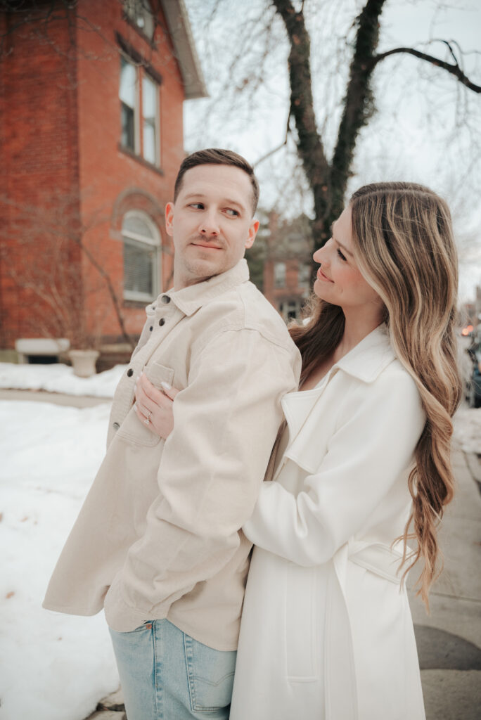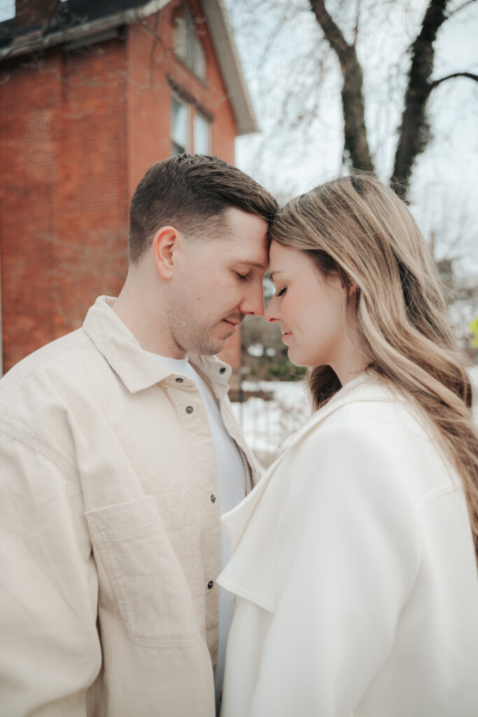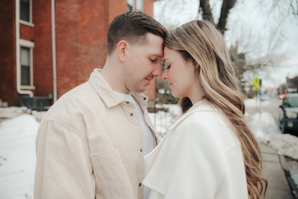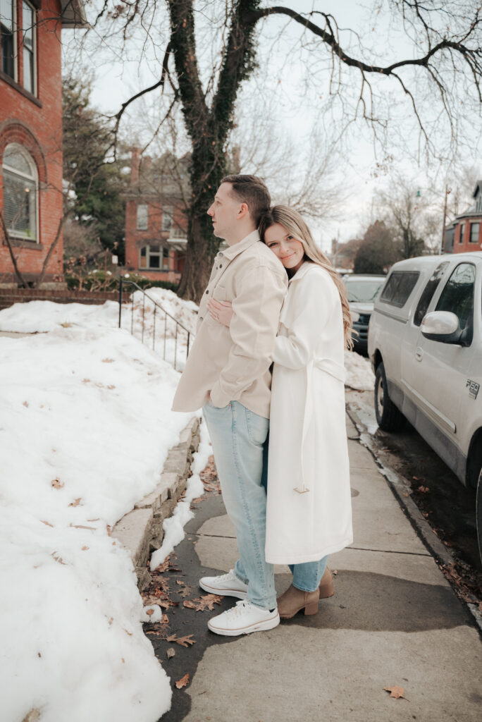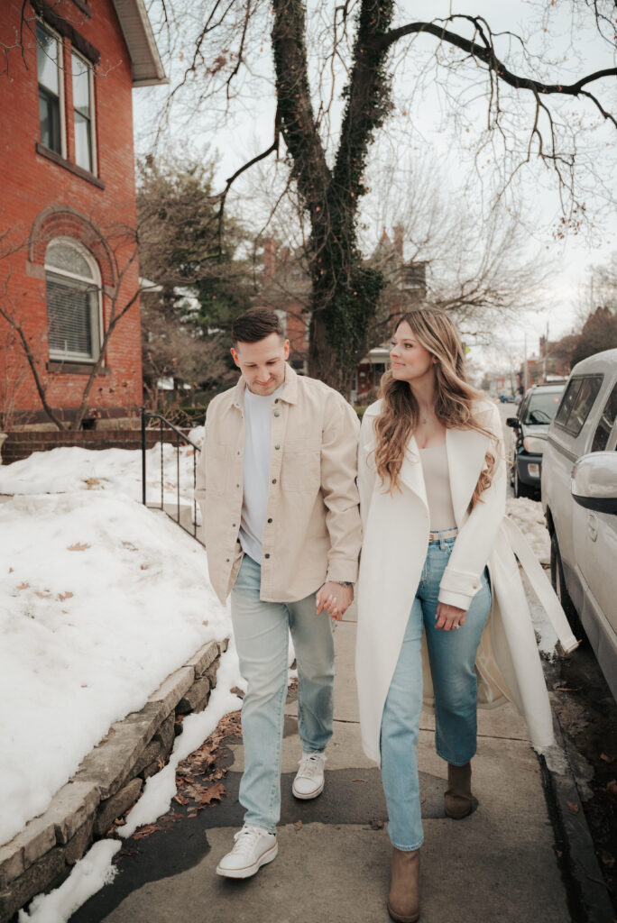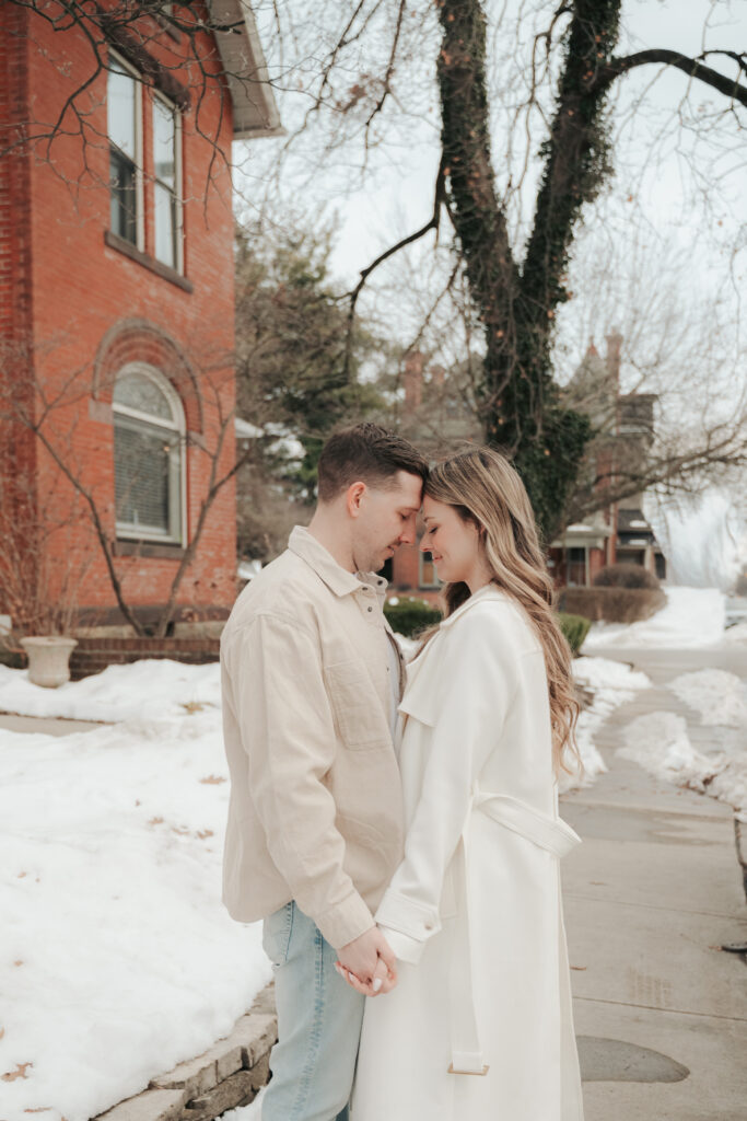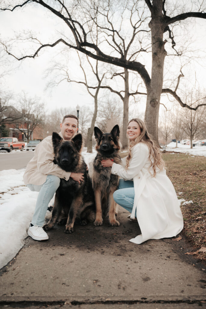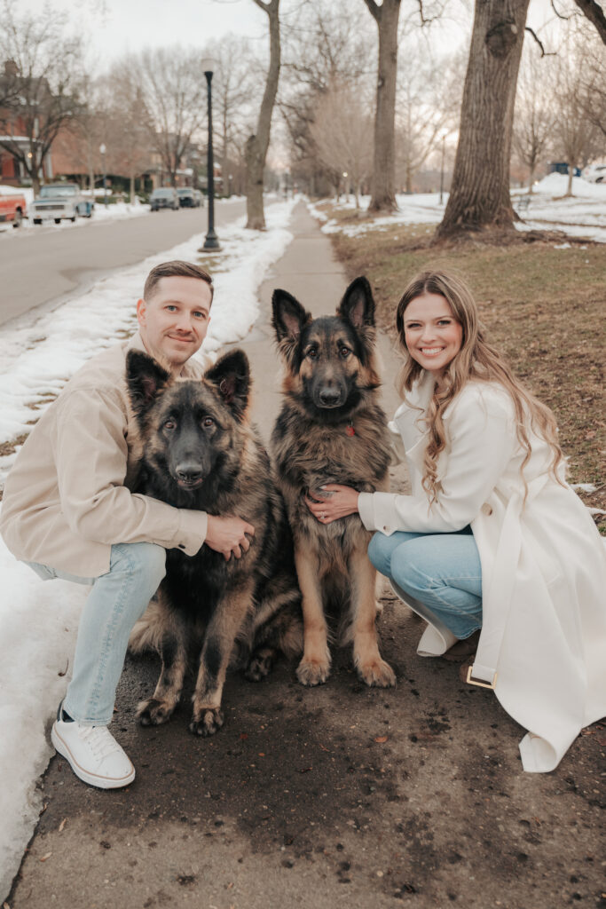After the Statehouse, we ended the night in German Village with their dogs. This part felt especially sweet. Snow lined the sidewalks, the trees were bare, and the neighborhood was quiet in that peaceful winter way. Watching them walk side by side with their dogs felt like getting a glimpse into their everyday life together.