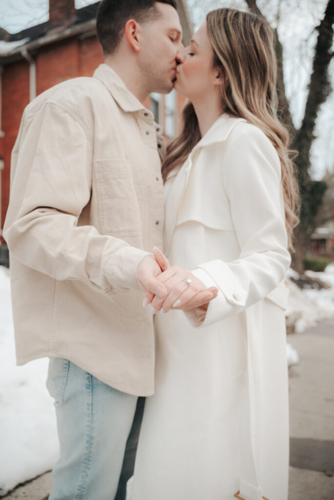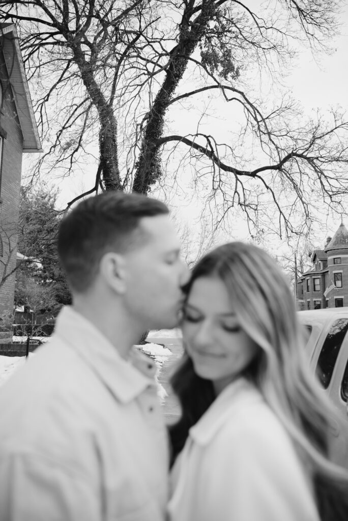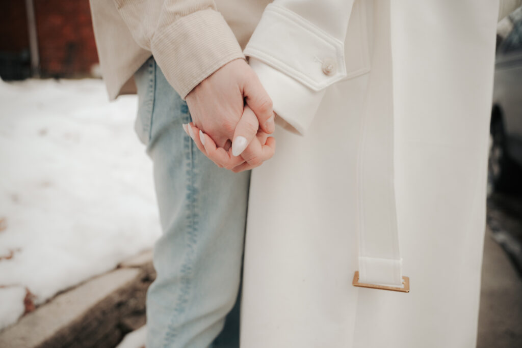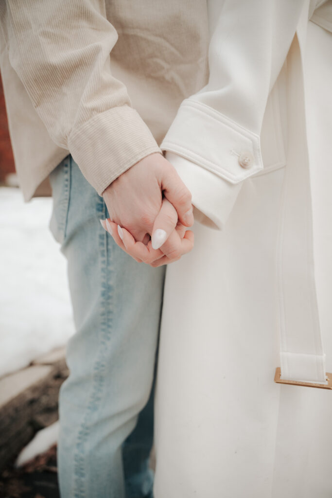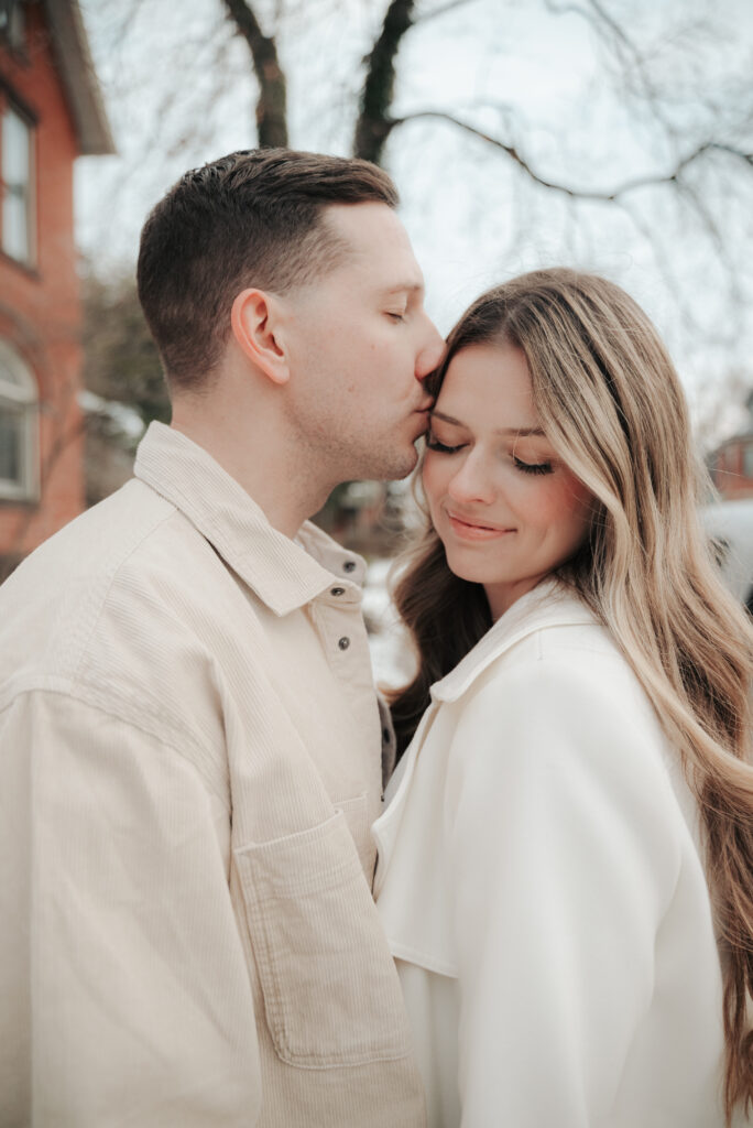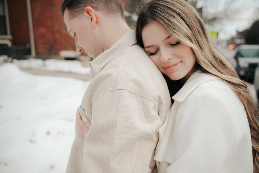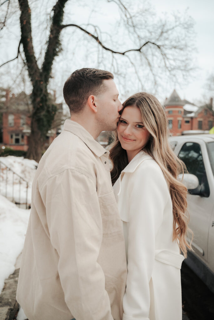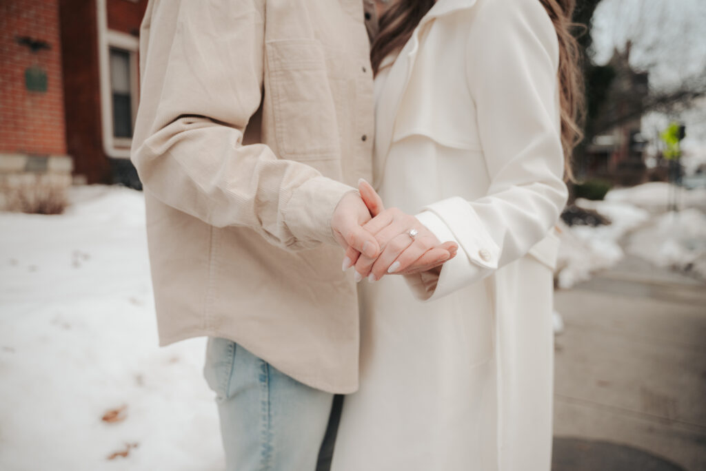 After the Statehouse, we ended the night in German Village with their dogs. This part felt especially sweet. Snow lined the sidewalks, the trees were bare, and the neighborhood was quiet in that peaceful winter way. Watching them walk side by side with their dogs felt like getting a glimpse into their everyday life together.