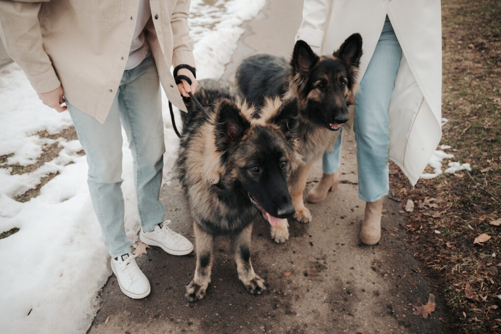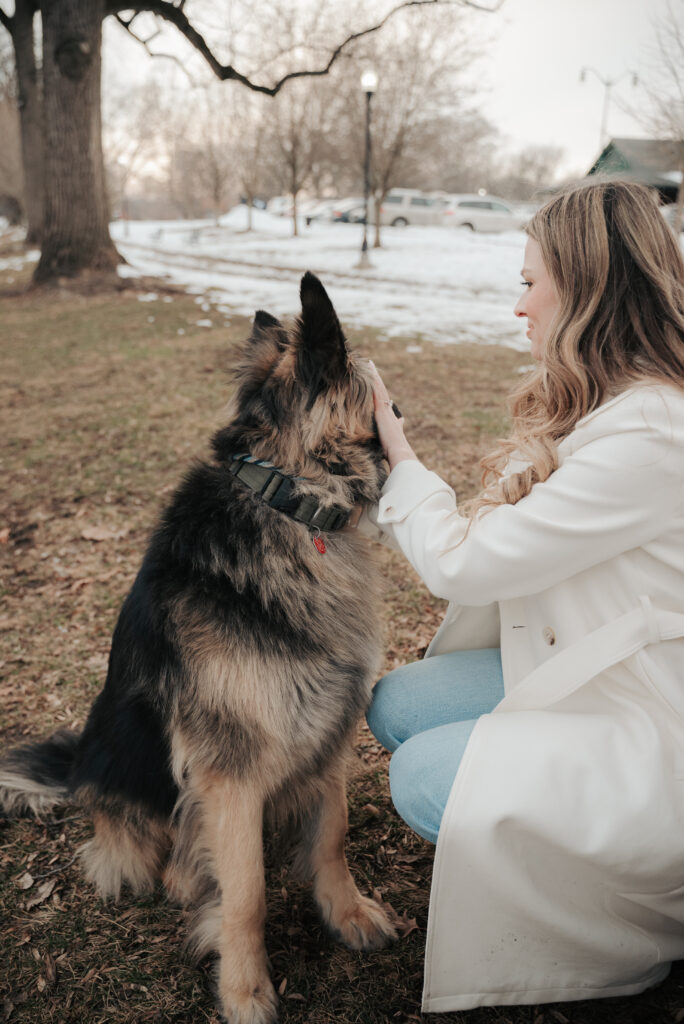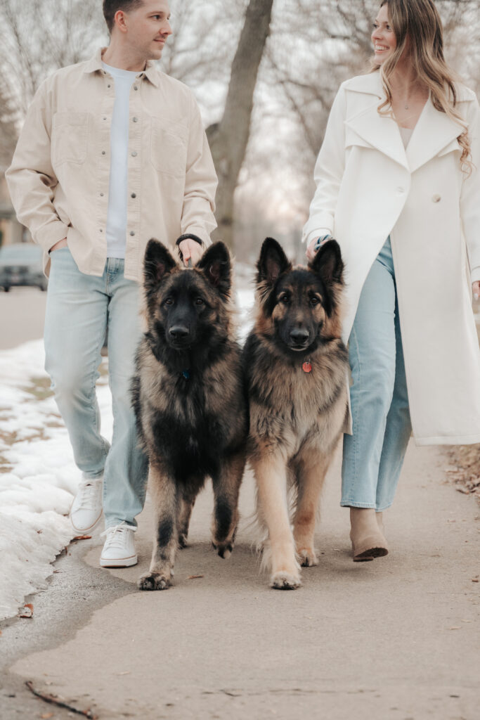 They crouched down in the cold to hug their dogs close. Aly’s smile when she looks at Dylan is the kind that feels genuine and unguarded. He steadies the leash with one hand and looks back at her like this is just home for him. It was simple and real and full of love.
