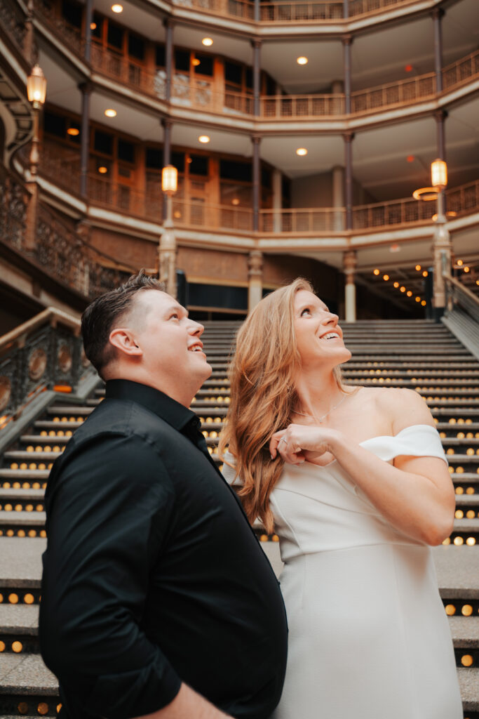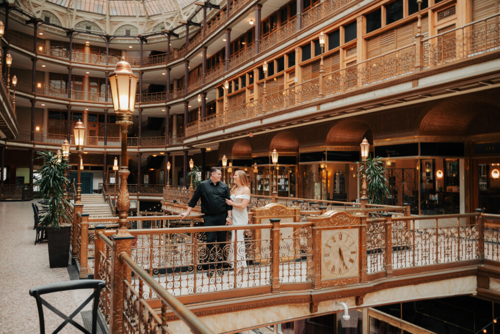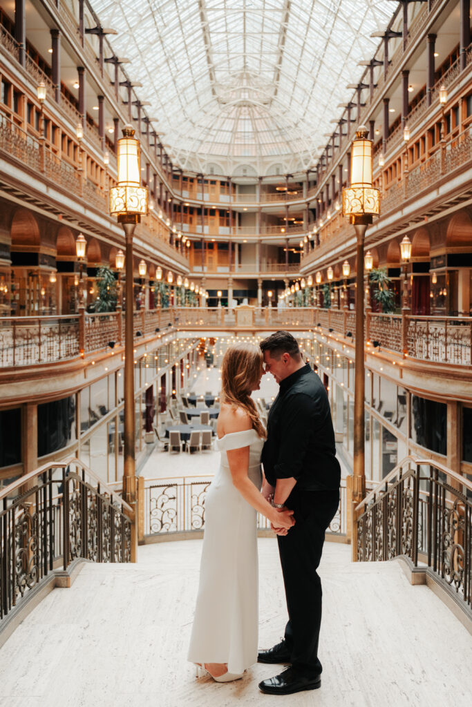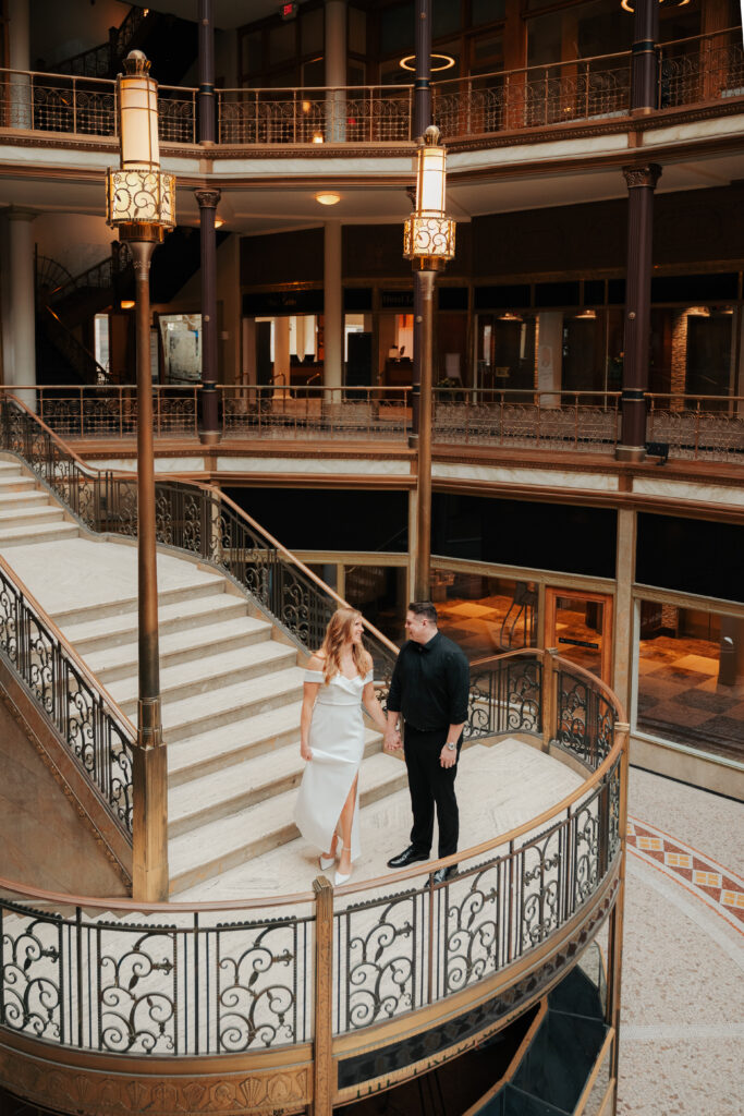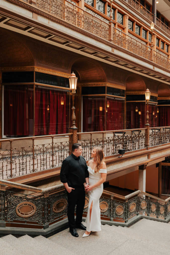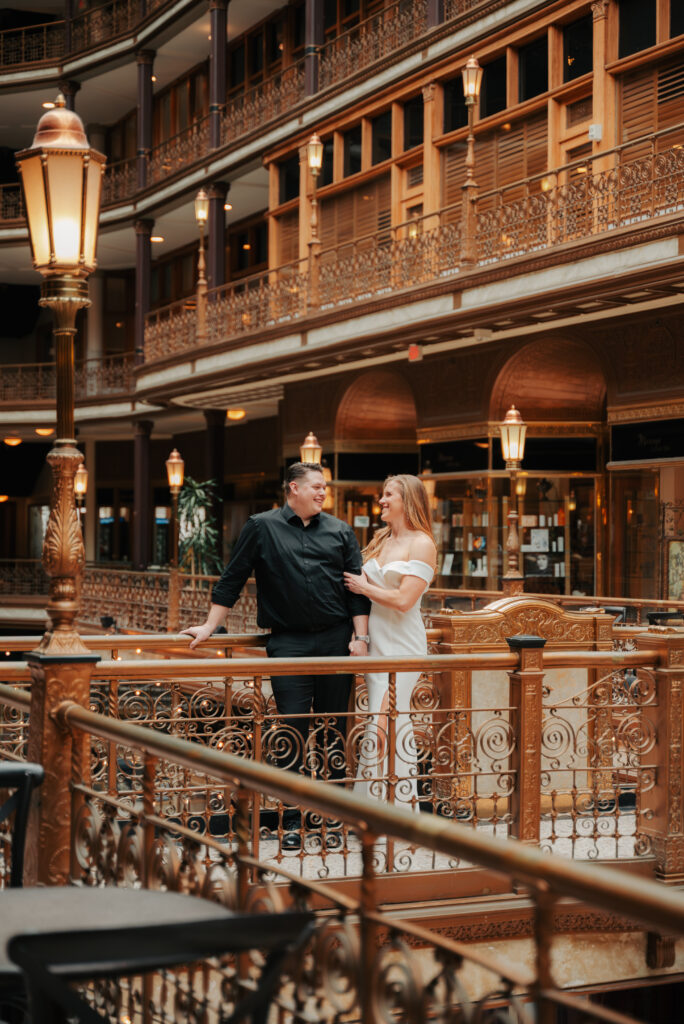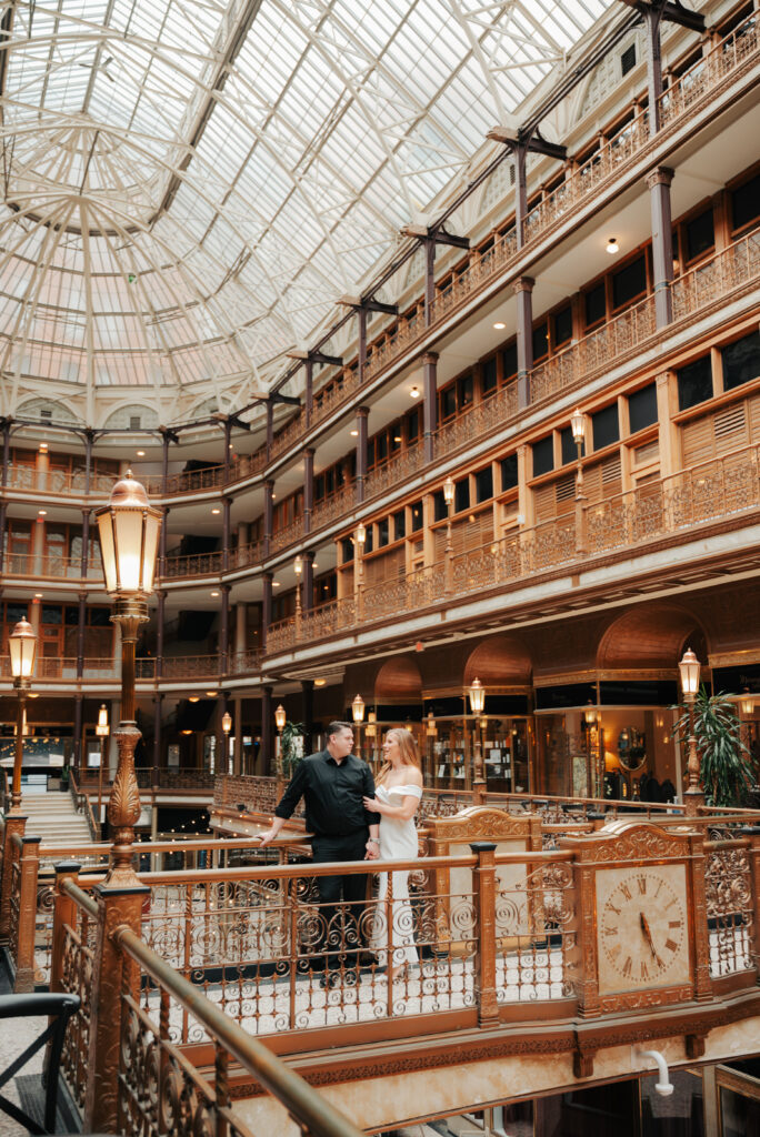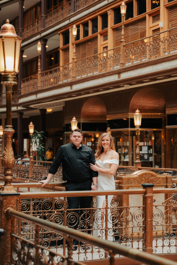 We went back there for their engagement session and it just made sense to be in the same place where it all happened. If you’re looking for a Cleveland Arcade engagement session location, I will always recommend it. There’s so much variety and it photographs so well without having to overthink it. We kept things pretty natural inside, with a mix of light direction and letting moments happen as they were. At one point we realized we were parked in the garage right there, so we decided to go up to the top just to see what it looked like. It wasn’t part of the plan at all, but once we got up there it was so good.