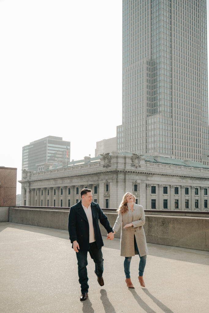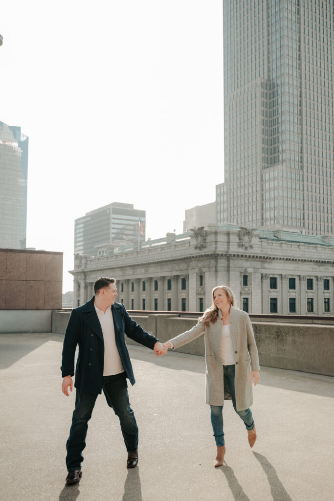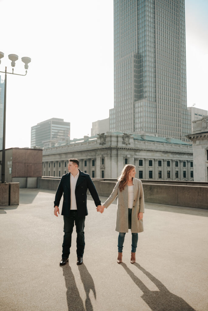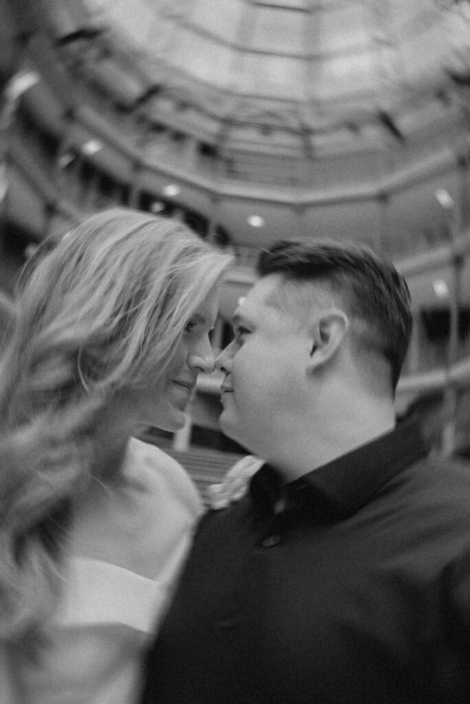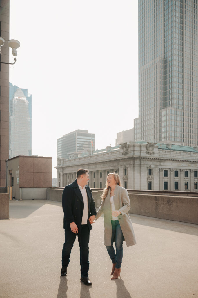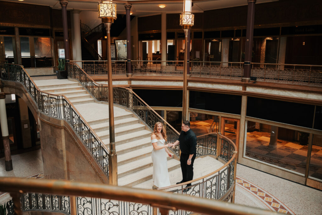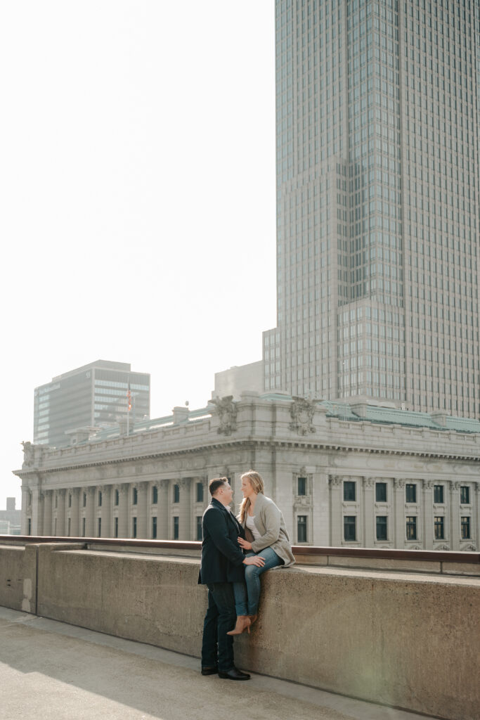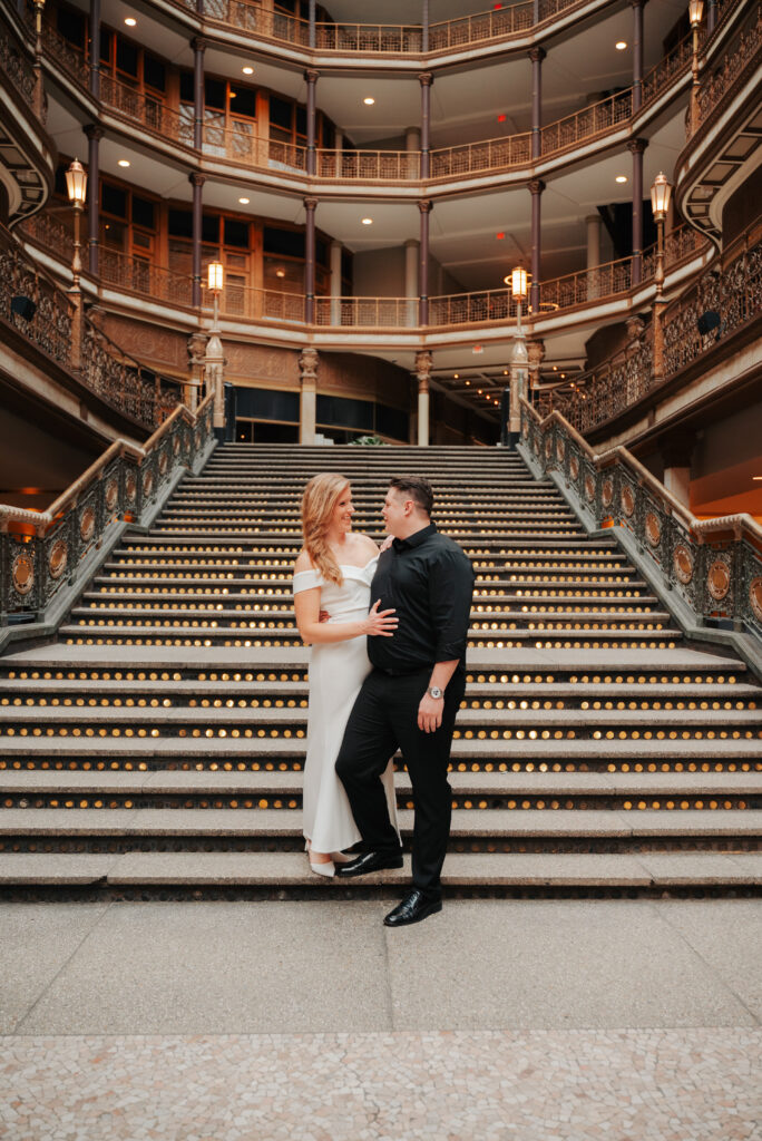 We went back there for their engagement session and it just made sense to be in the same place where it all happened. If you’re looking for a Cleveland Arcade engagement session location, I will always recommend it. There’s so much variety and it photographs so well without having to overthink it. We kept things pretty natural inside, with a mix of light direction and letting moments happen as they were. At one point we realized we were parked in the garage right there, so we decided to go up to the top just to see what it looked like. It wasn’t part of the plan at all, but once we got up there it was so good.