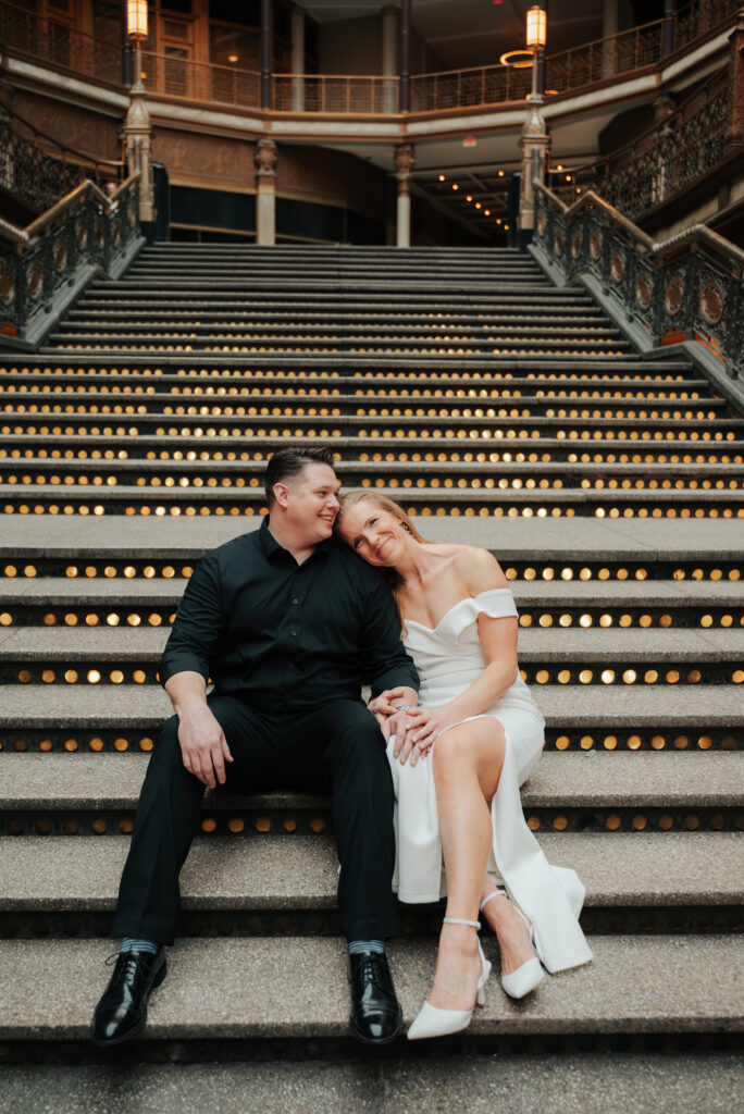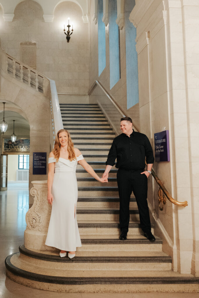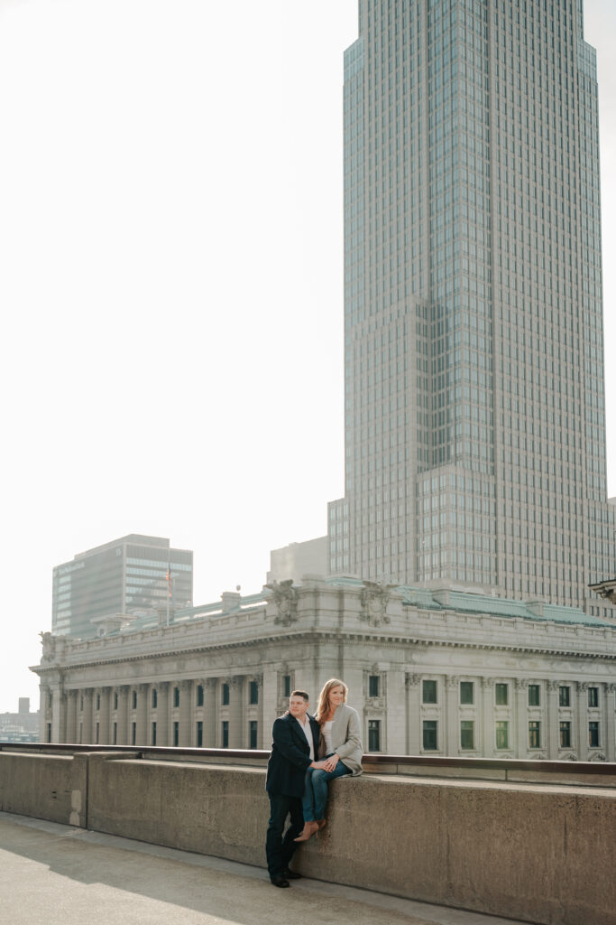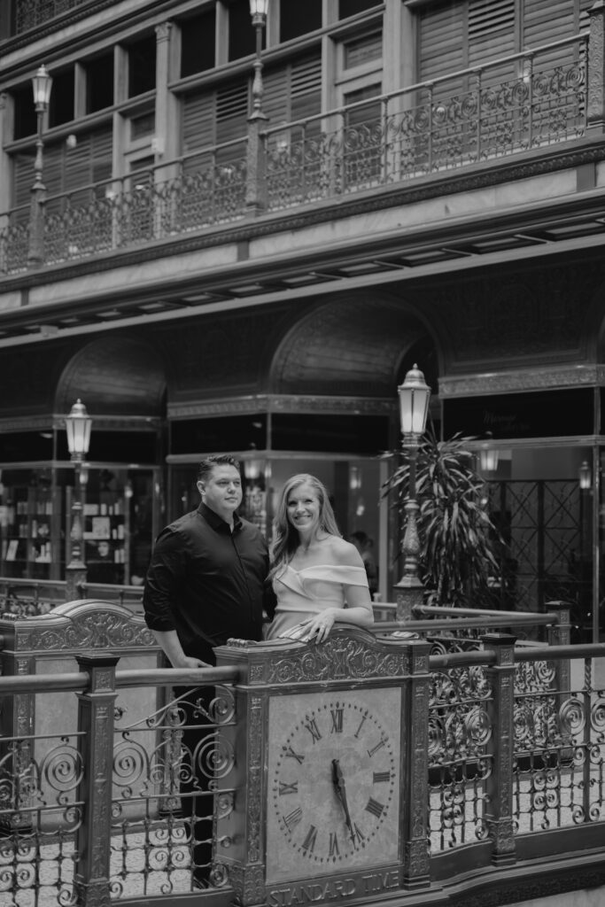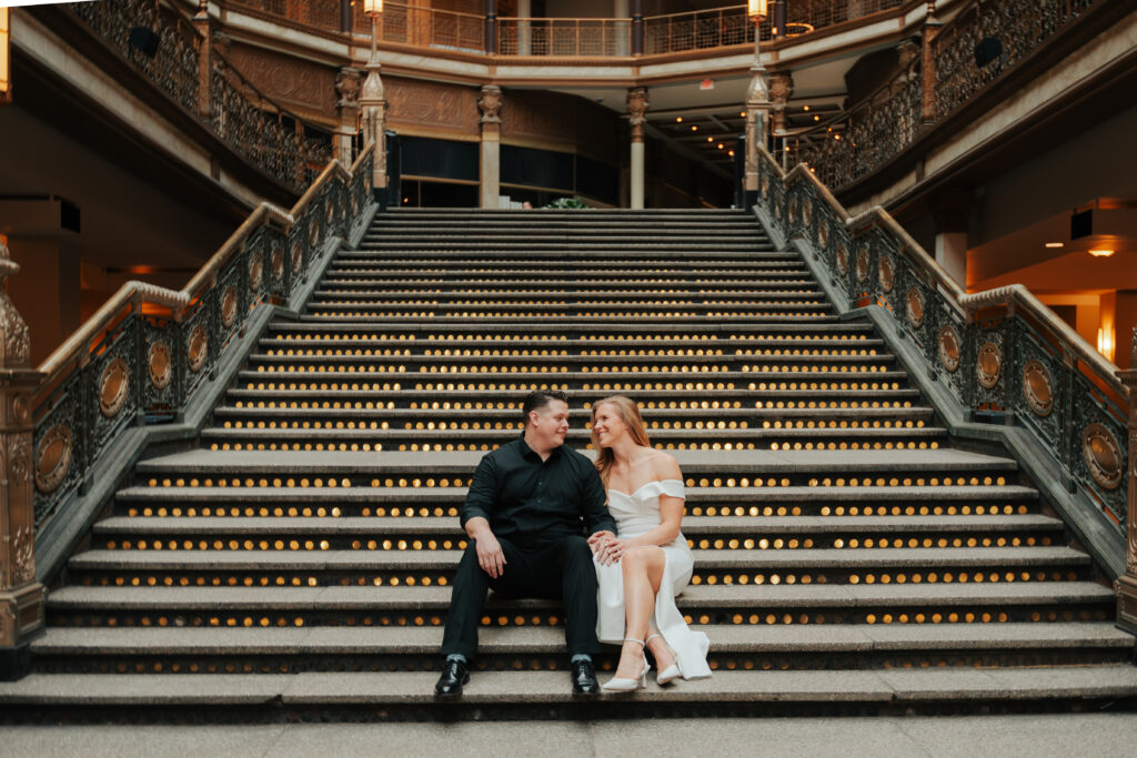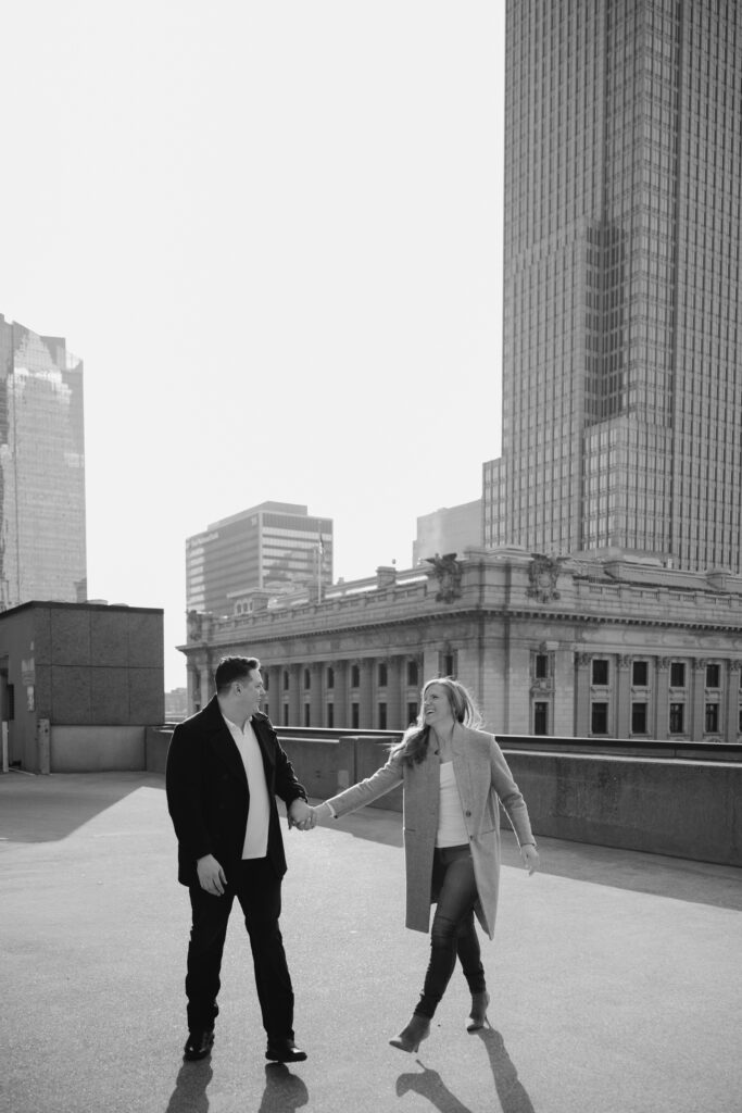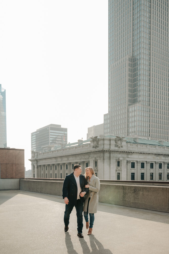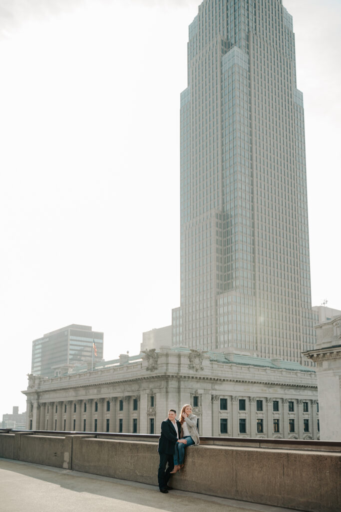 We went back there for their engagement session and it just made sense to be in the same place where it all happened. If you’re looking for a Cleveland Arcade engagement session location, I will always recommend it. There’s so much variety and it photographs so well without having to overthink it. We kept things pretty natural inside, with a mix of light direction and letting moments happen as they were. At one point we realized we were parked in the garage right there, so we decided to go up to the top just to see what it looked like. It wasn’t part of the plan at all, but once we got up there it was so good.
