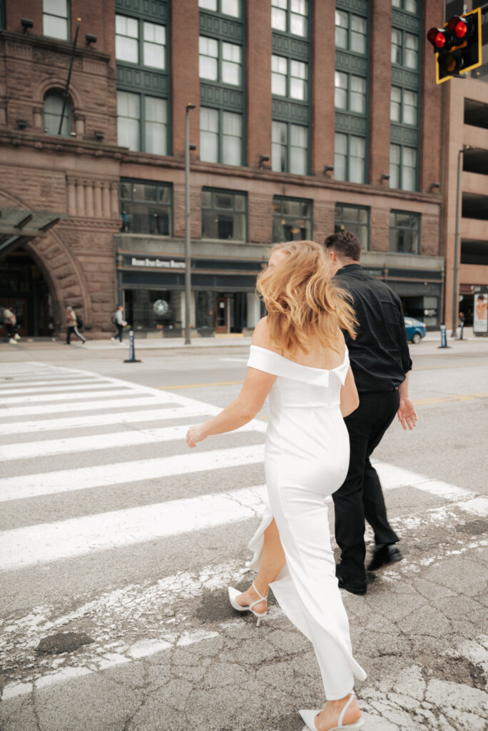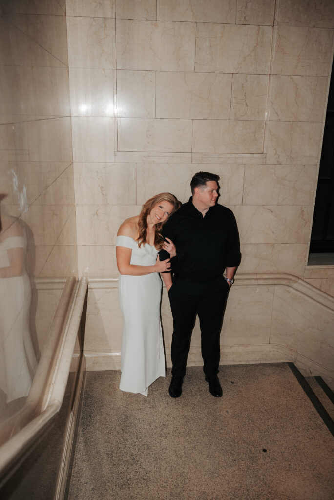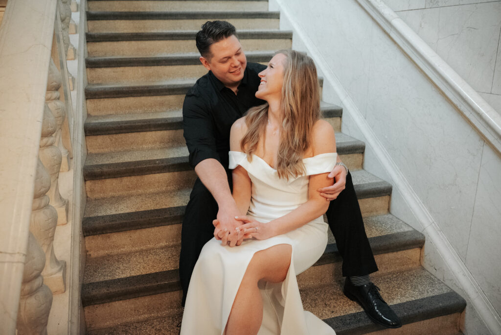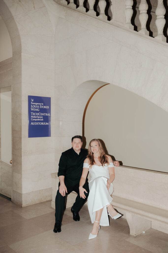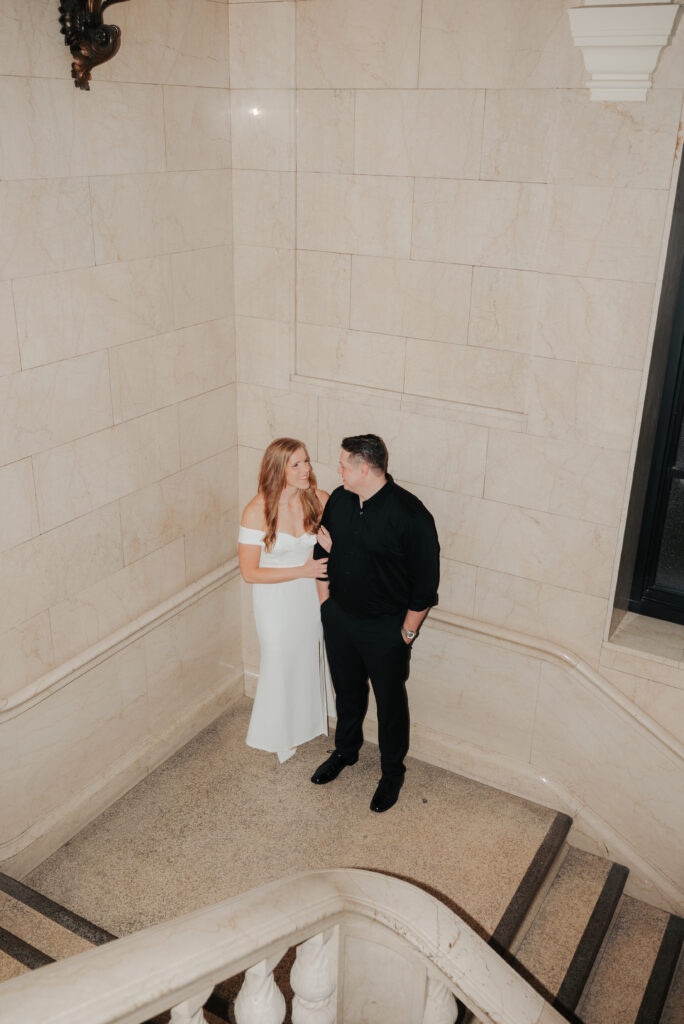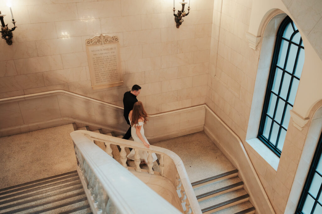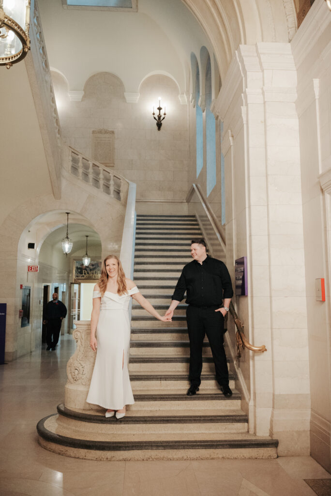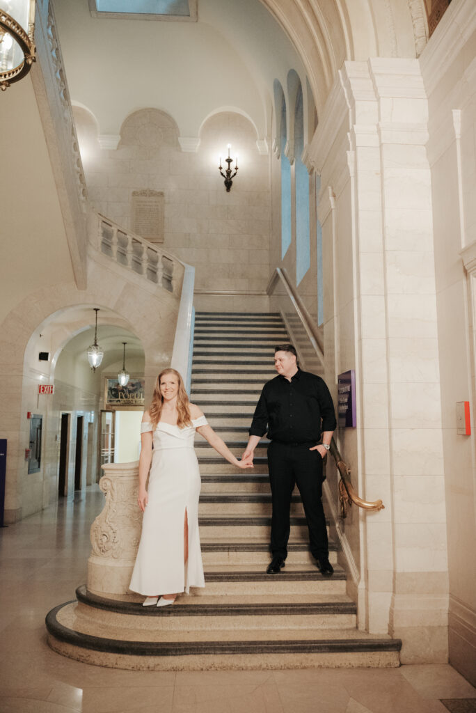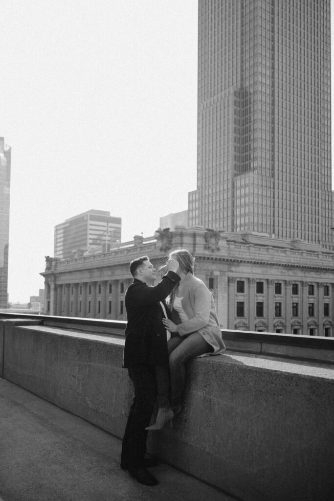 We went back there for their engagement session and it just made sense to be in the same place where it all happened. If you’re looking for a Cleveland Arcade engagement session location, I will always recommend it. There’s so much variety and it photographs so well without having to overthink it. We kept things pretty natural inside, with a mix of light direction and letting moments happen as they were. At one point we realized we were parked in the garage right there, so we decided to go up to the top just to see what it looked like. It wasn’t part of the plan at all, but once we got up there it was so good.