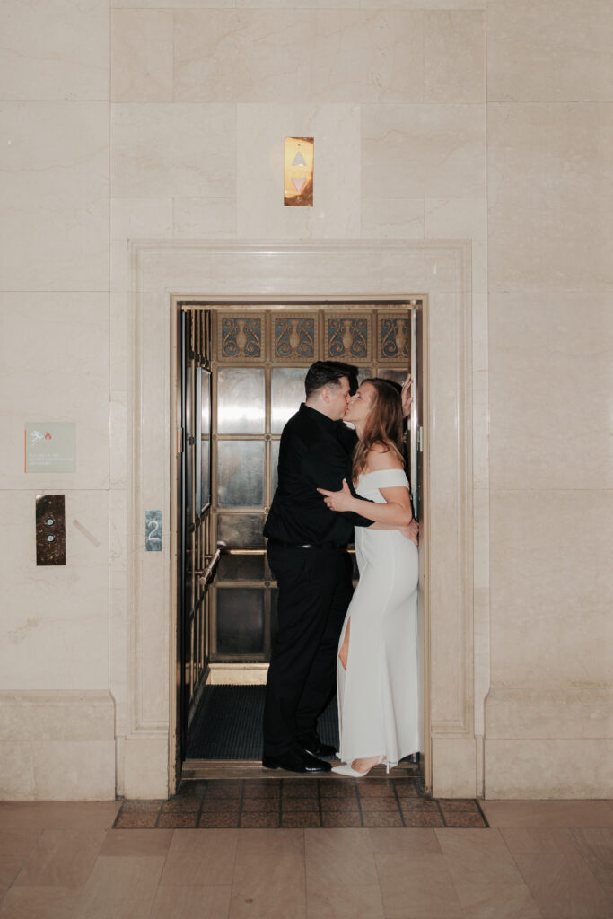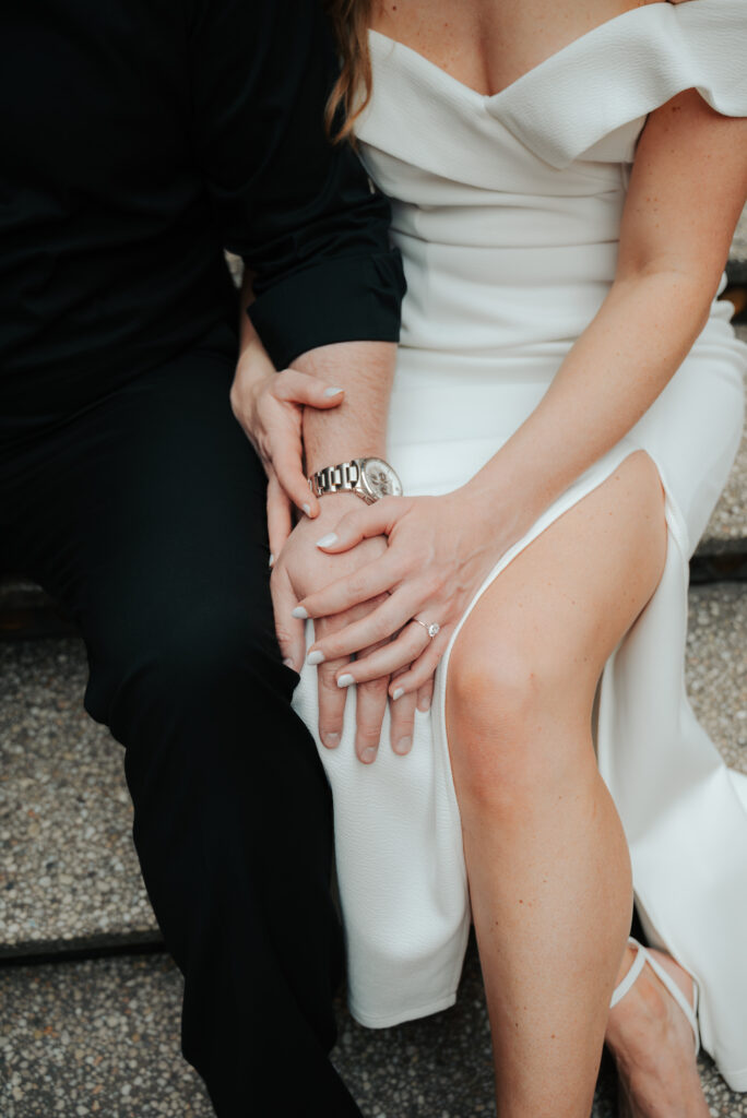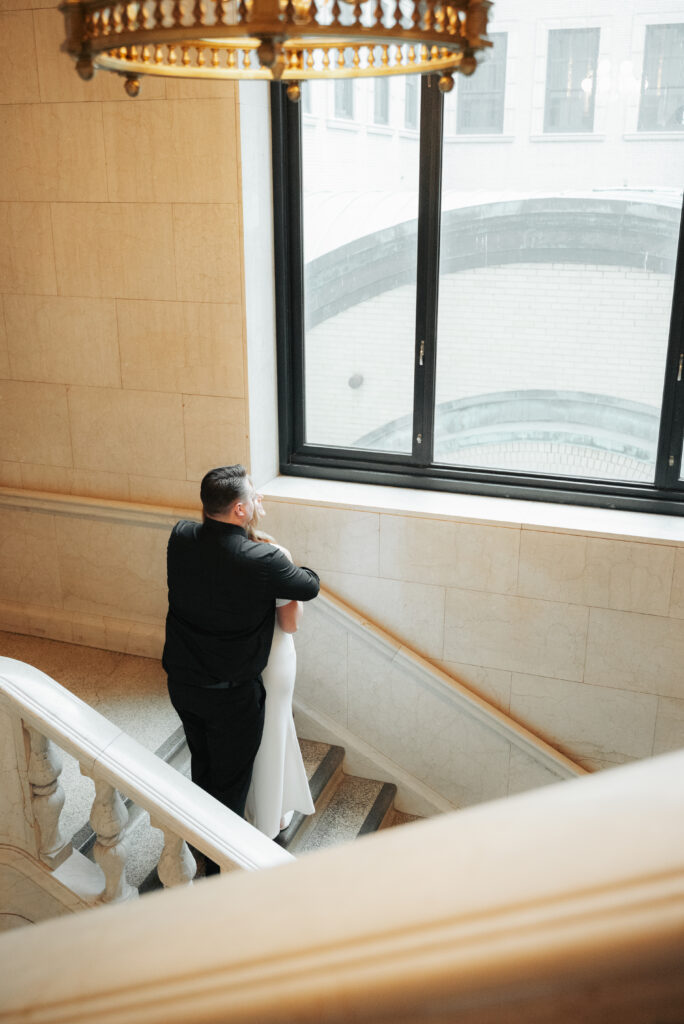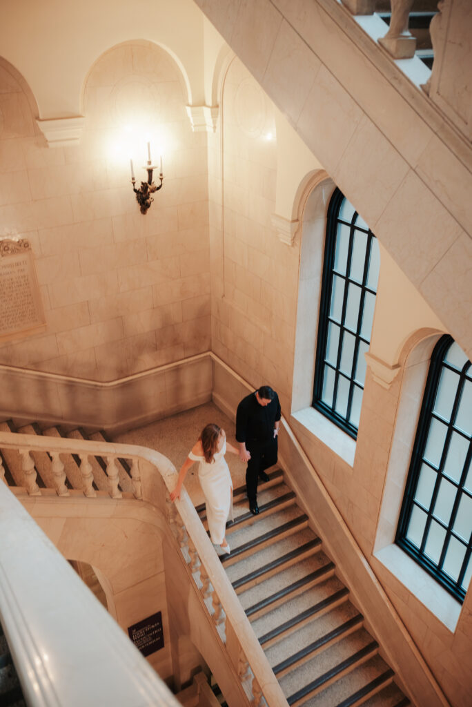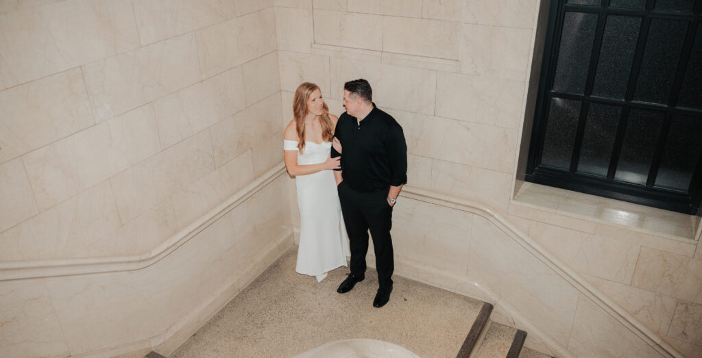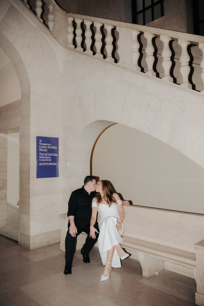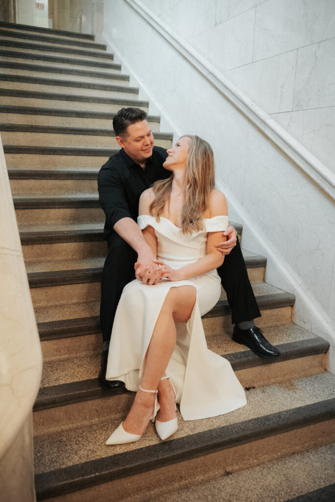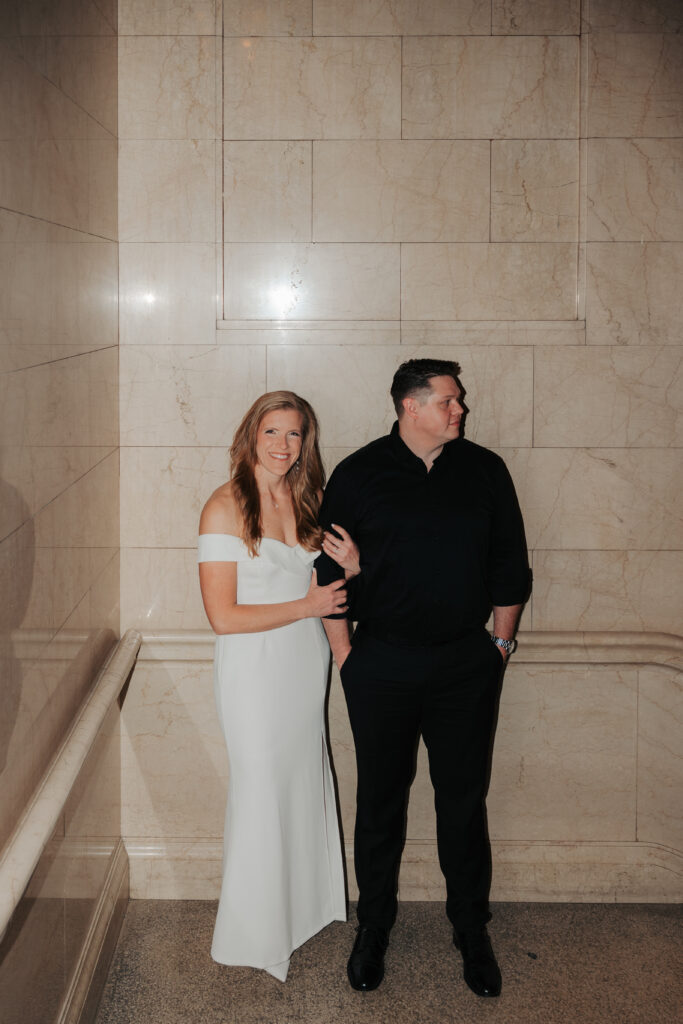 We went back there for their engagement session and it just made sense to be in the same place where it all happened. If you’re looking for a Cleveland Arcade engagement session location, I will always recommend it. There’s so much variety and it photographs so well without having to overthink it. We kept things pretty natural inside, with a mix of light direction and letting moments happen as they were. At one point we realized we were parked in the garage right there, so we decided to go up to the top just to see what it looked like. It wasn’t part of the plan at all, but once we got up there it was so good.